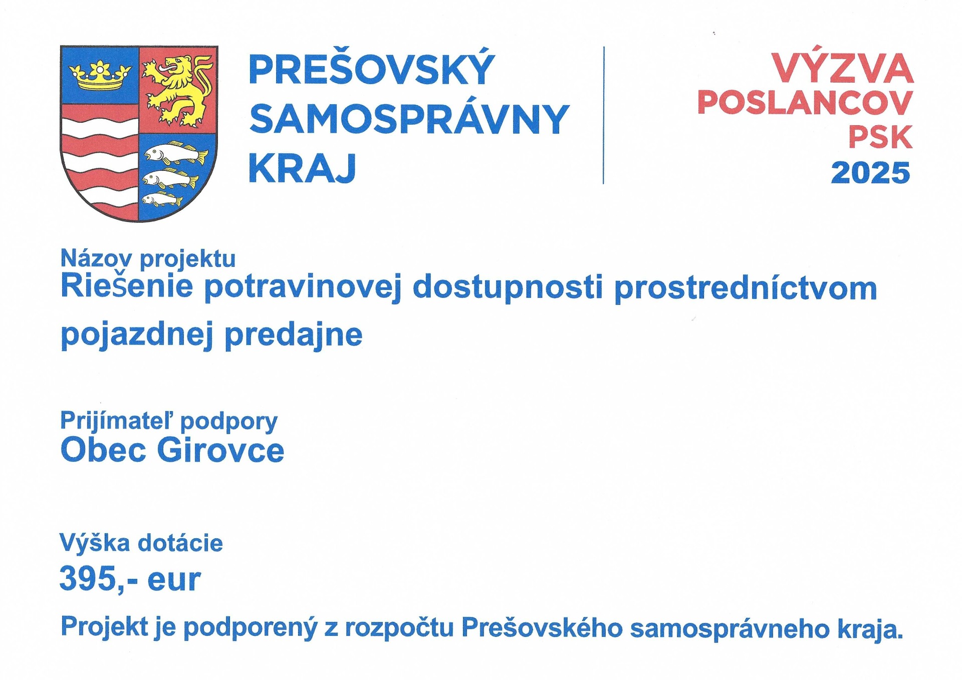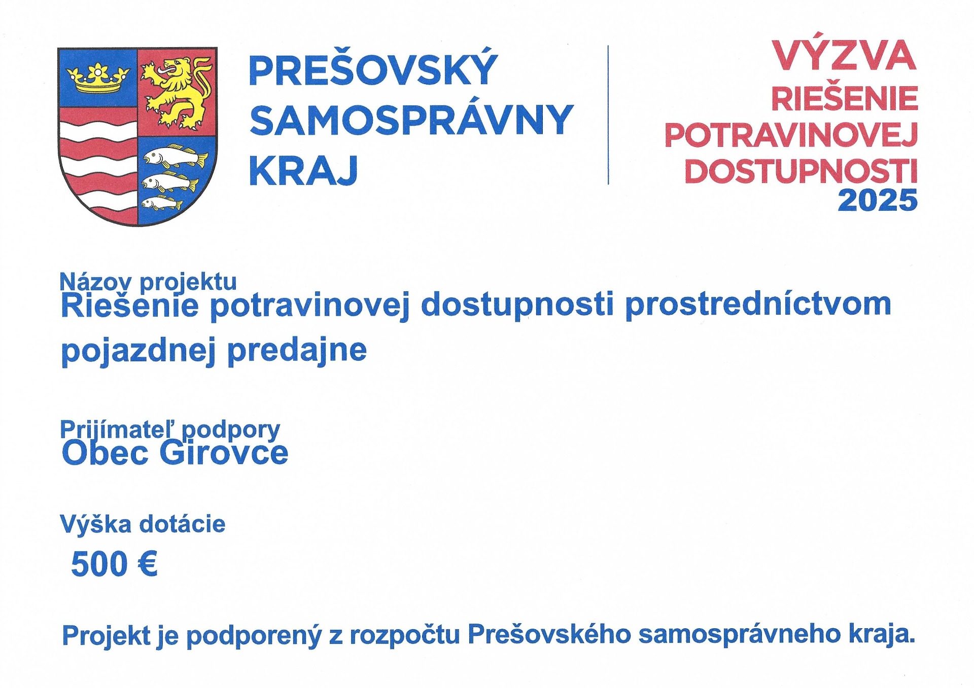Projekt Riešenie potravinovej dostupnosti prostredníctvom pojazdnej predajne bol podporený poslancami PSK. Uvedená suma bola uhradená dodávateľovi - firme POSTAP s.r.o. Ondavské Matiašovce ako podpora mobilnej formy predaja. Projekt splnil stanovené ciele a preukázal, že mobilná forma predaja je efektívnym spôsobom, ako zabezpečiť dostupnosť potravín v menších obciach bez kamenných predajní.